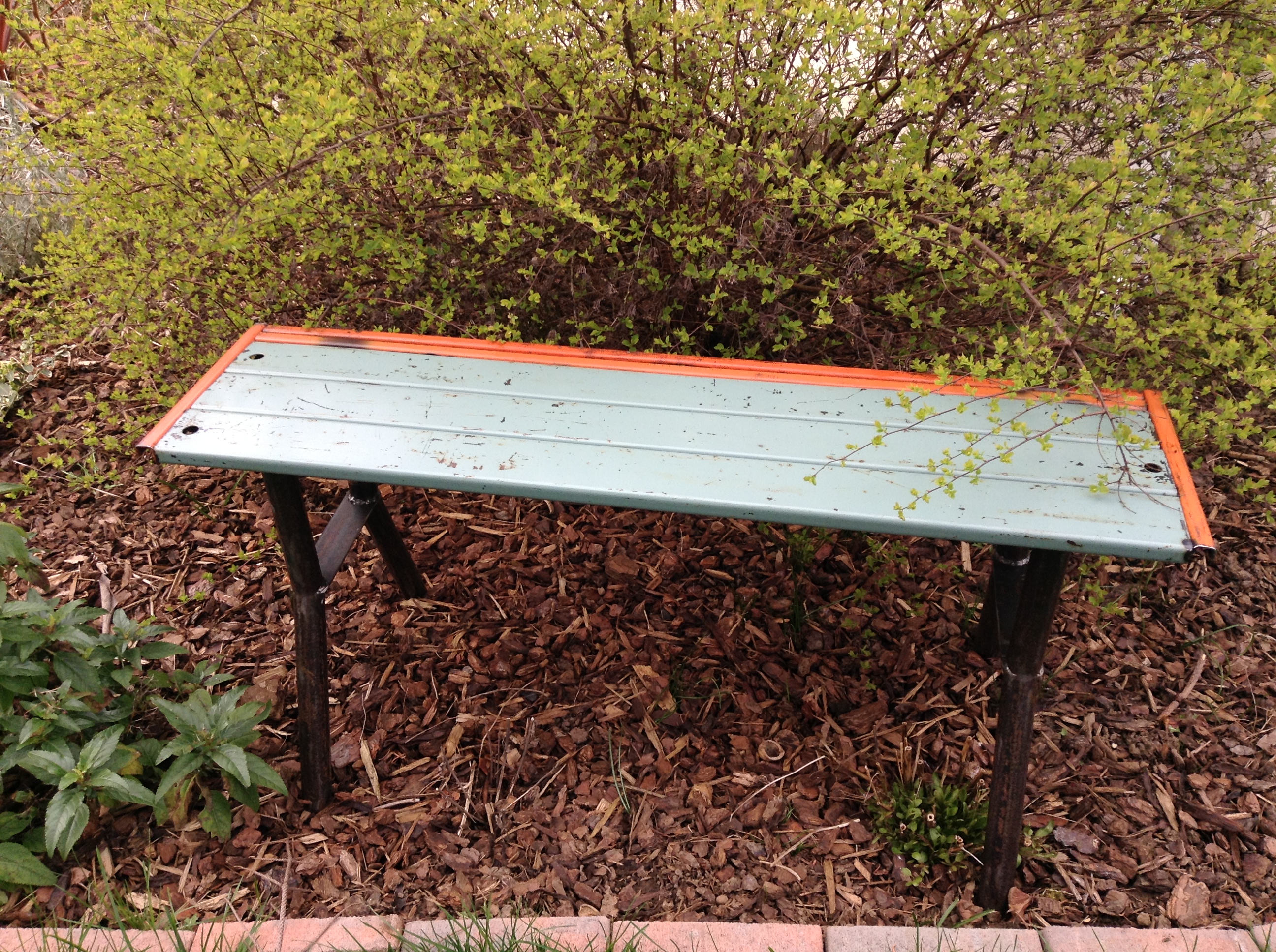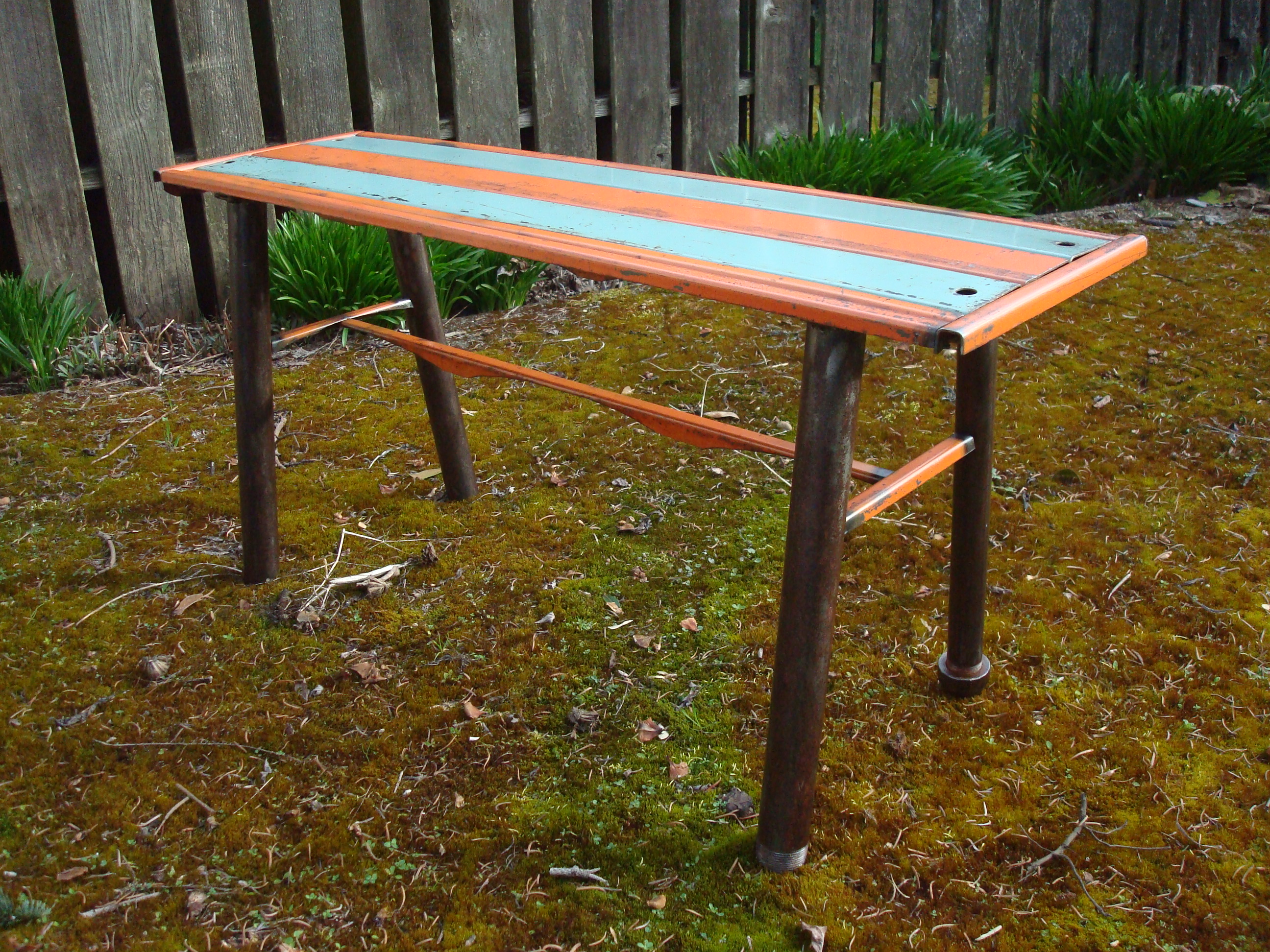 Benches are made with all reclaimed metal bits: pre painted distressed slats, random square stock or pipe legs, some still have plumbing connections or threaded ends.