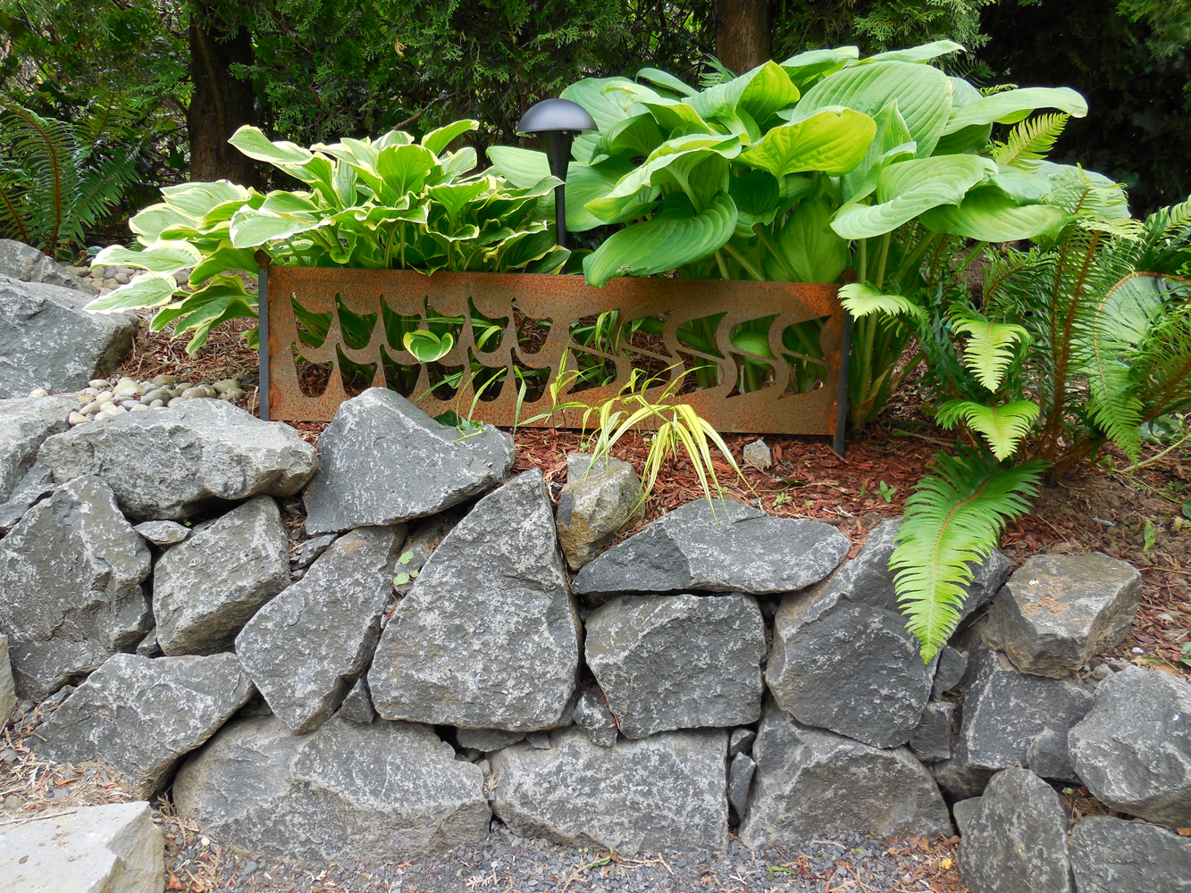 These were sold at the Yard, Garden & Patio show, a low fence and some fiddlehead ferns. These fiddleheads were placed where the future ones would be planted. In the after photo the hostas really pop next to the laser cut steel. Thanks Bunny, for the pictures!