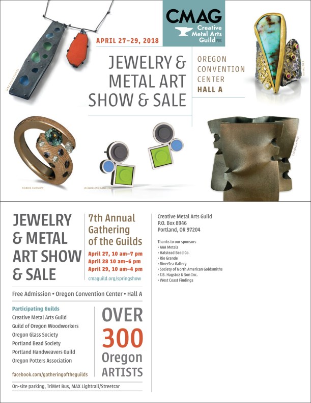 A GATHERING OF THE GUILDS which includes my guild, the CREATIVE METAL ARTS GUILD will be held at the Oregon Convention Center, April 27th – 29th. Booth 1-M.