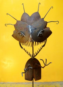 - Dinosaur Predator front: three shovels, ball bearings, rake for upper jaw, pitch fork tendrils, rebar, wrought iron scrap elements.