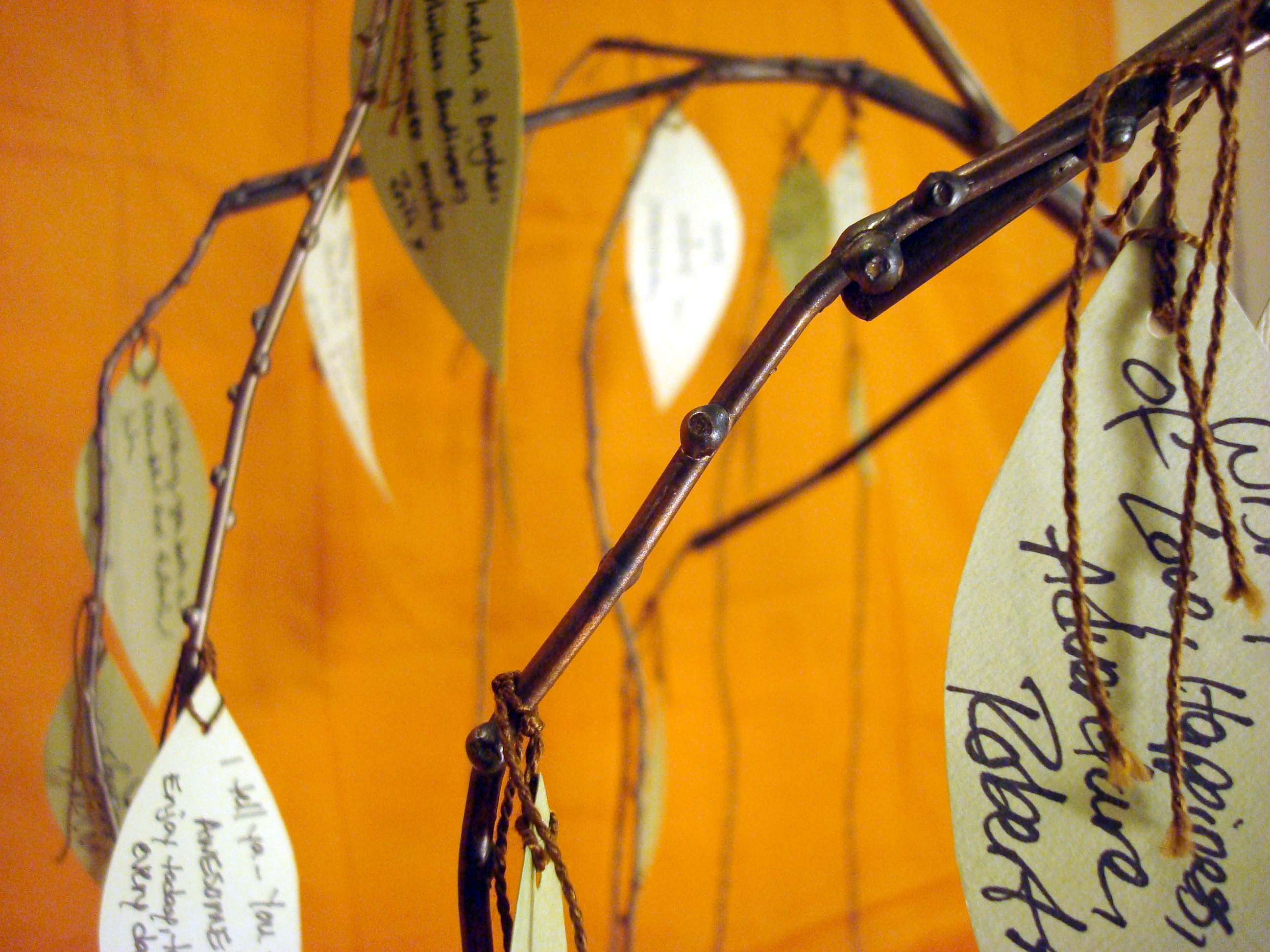 - wedding willow, 3’W x 2’H. I created this custom tree for my client’s wedding. Each guest was invited to write a message for the couple on a leaf and tie it onto a branch. The piece now is a focal point in their landscape.