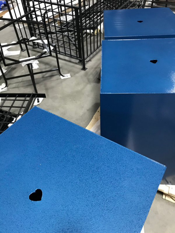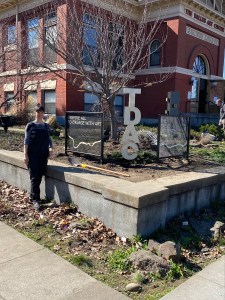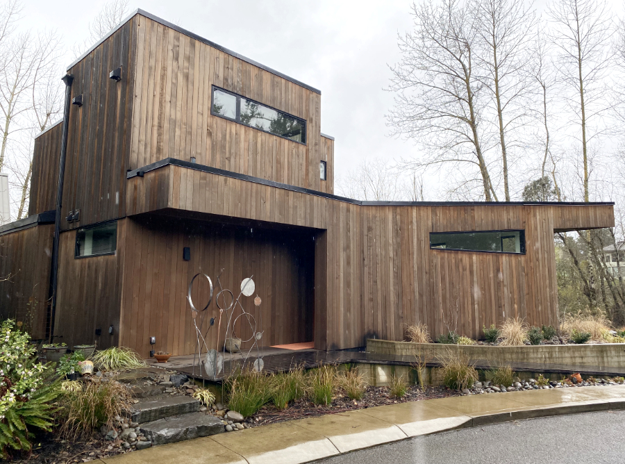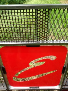 - Sign for a home business, Camas, WA. Center is her laser cut powder coated initial. Box tube corner is filled with a variety of textures; perforated steel, expanded mesh and woven mesh.
