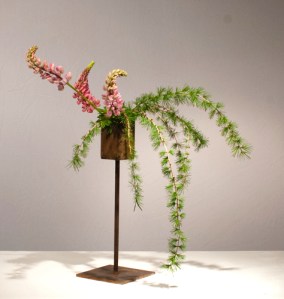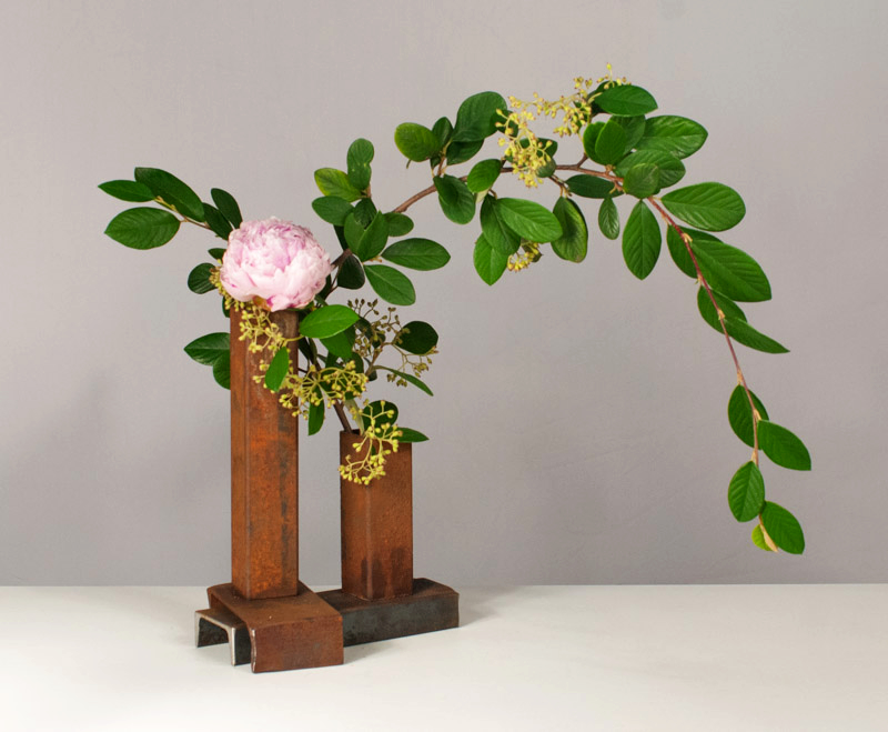 - Vase, reclaimed steel, 18″H. Photos by Amy Stahl, Ikebana artist.
