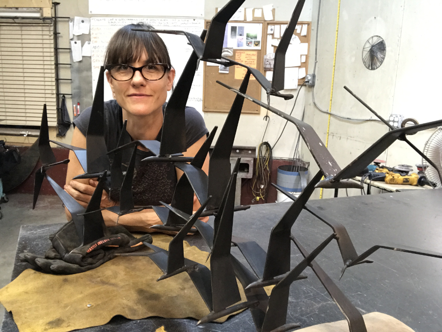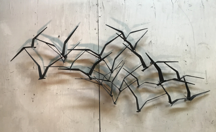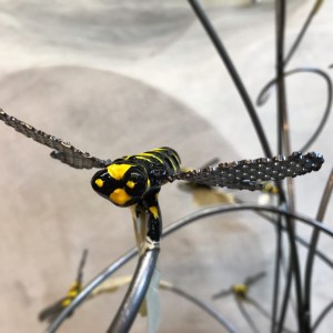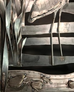 - Bee detail from Swarm sculpture. Rebar and perforated steel. Swarm 8’Hx30″W.