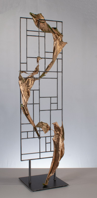 - Petit Mondrian, 51″H x 12″W. Removable base for alternate floral frames. Photo by Ikebana artist Amy Stahl.