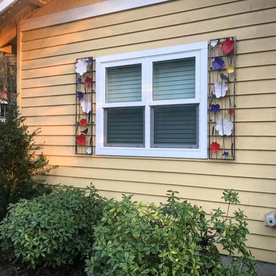- Window Shutters, 12″Wx 54″Hx3″D. Each panel includes a hand cut native bird with seven 7 flowers and a collection of vines.