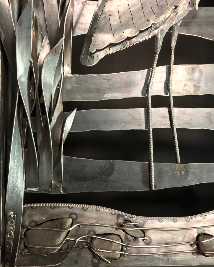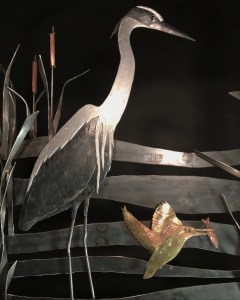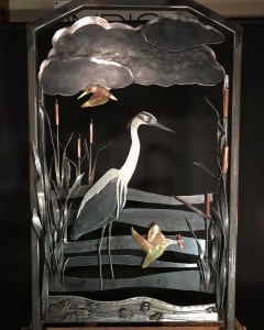 - Wetland Theme Gate. Hand hammered great blue heron built from aluminum and steel with aluminum rivets. Heron has a blue marble for an eye. 6.5’H x 50″H