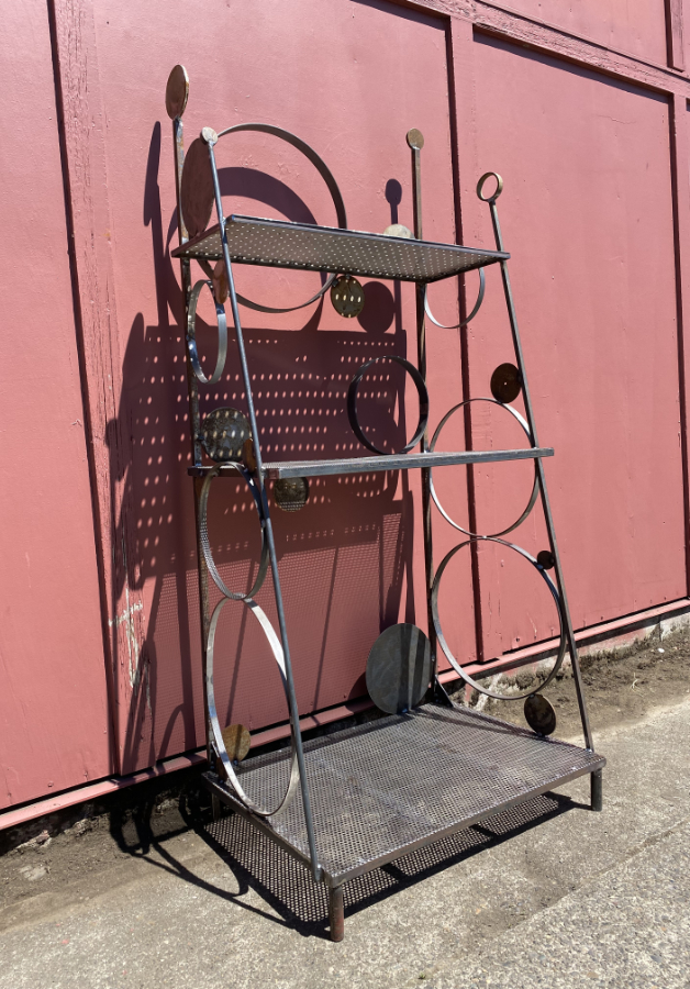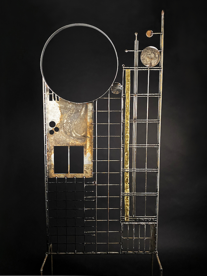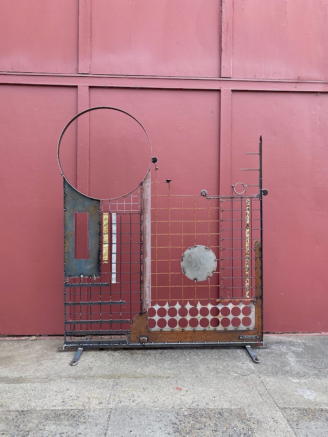 - Layered Scrappy Moongate, 7’Wx4’H. Materials: Brass, stainless, aluminum and steel.