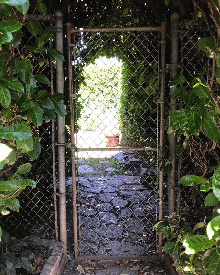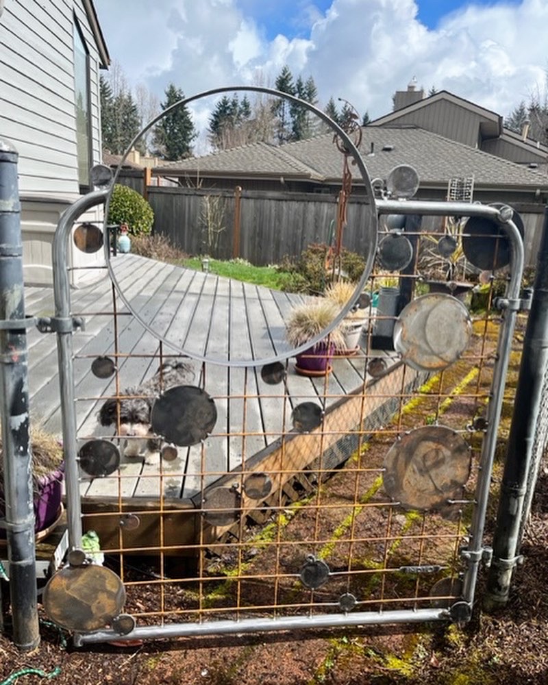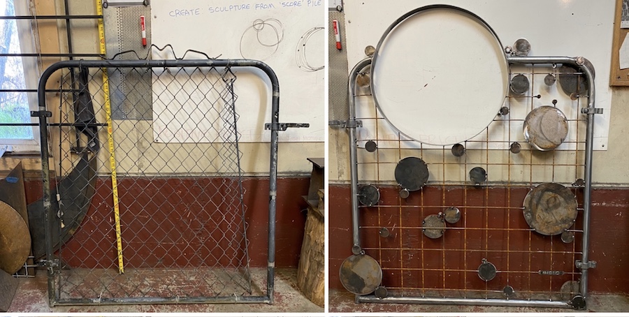 - Before and after of the Bubble Moongate gate, reclaimed chain link fence, 2023.