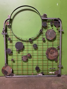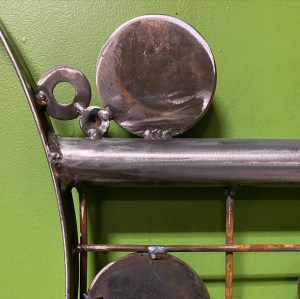 - Shield. plasma cut steel reclaimed from underground oil tank, gear train. 42″L x 10″W
