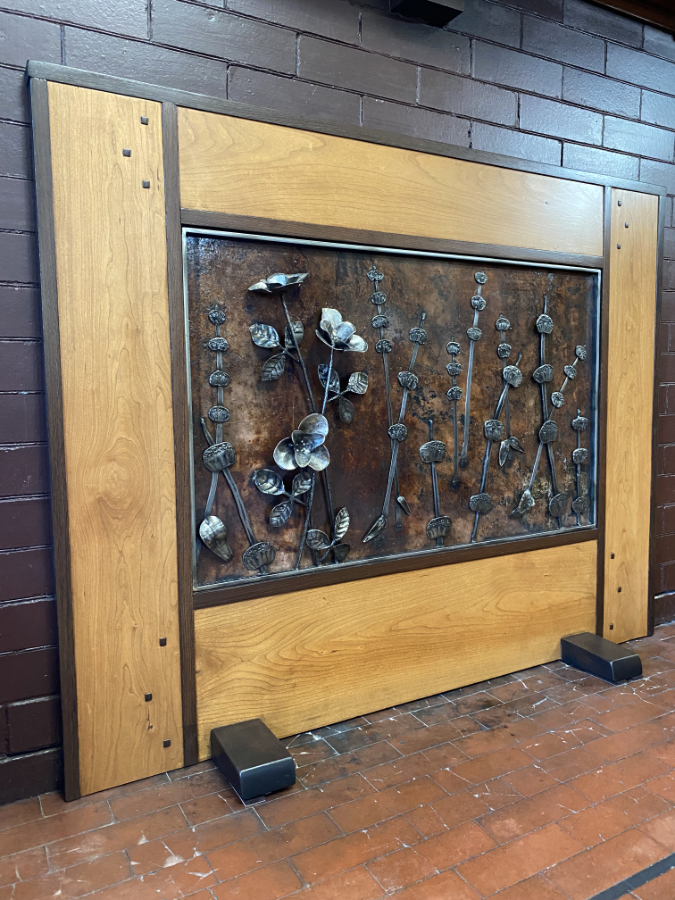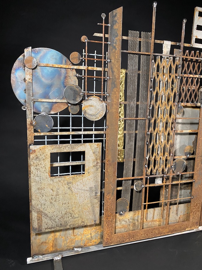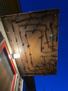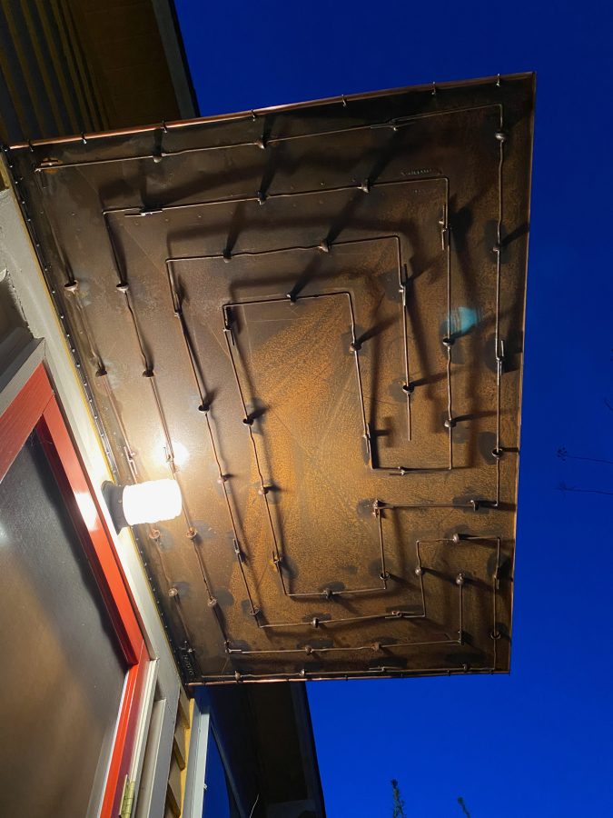 - Detail of the Labyrinth Awning. The request for this project was to use rusted reclaimed materials, add lots of texture and interest. There were copper railings nearby so I added copper to the awning as well. Steel and copper, 60″Wx38″D, 2023.