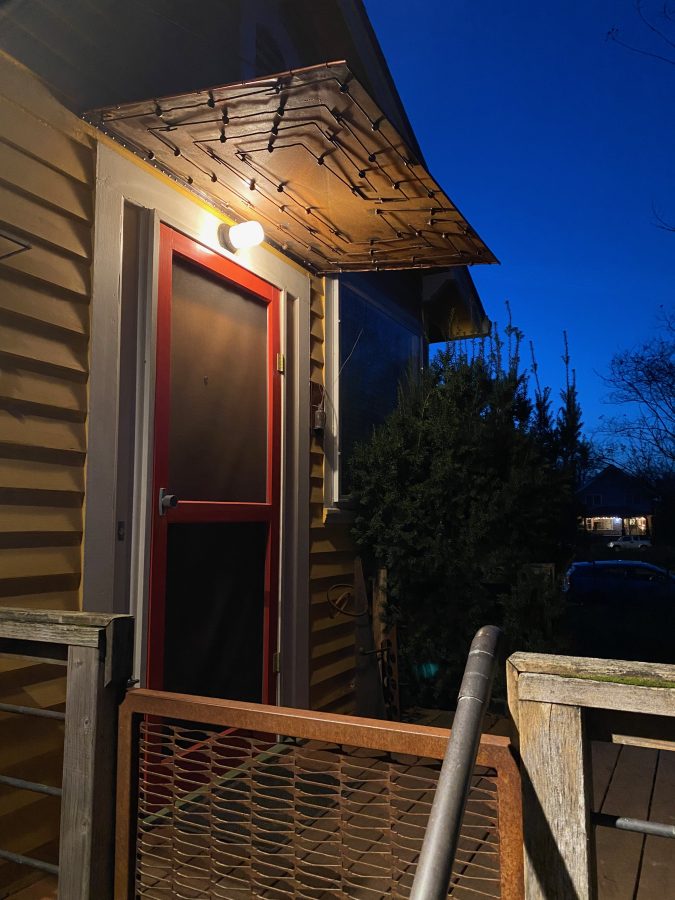 - Labyrinth Awning trimmed in copper, 60″Wx38″D, 2023.