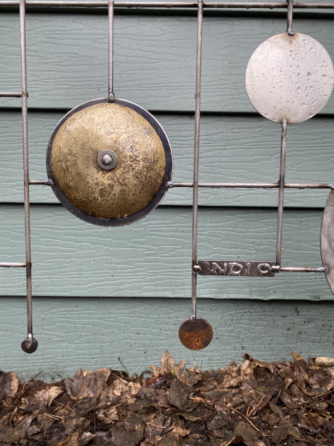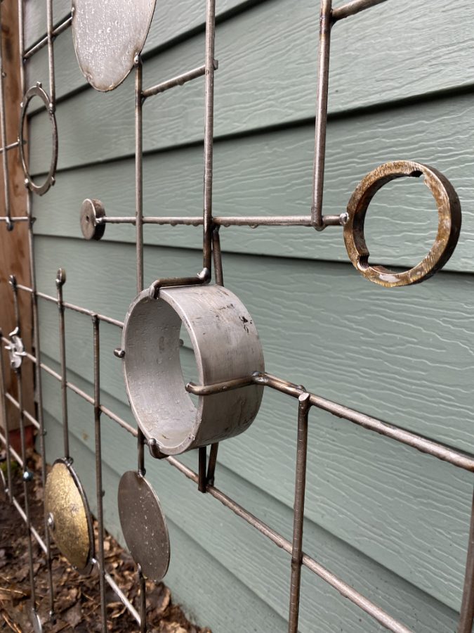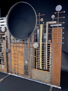 - Detail: Scrappy Moongate, 6.5’Hx36″W, brass and reclaimed steel.