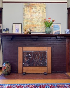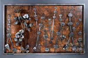 - Center detail of ‘3D Botanical’ of wild roses and dried Jerusalem Sage, 32″Wx20″Hx3″D. This will be mounted and framed in fine woodwork of the Arts and Crafts style. When the wood work is completed, the piece will insert into the front of a fireplace.