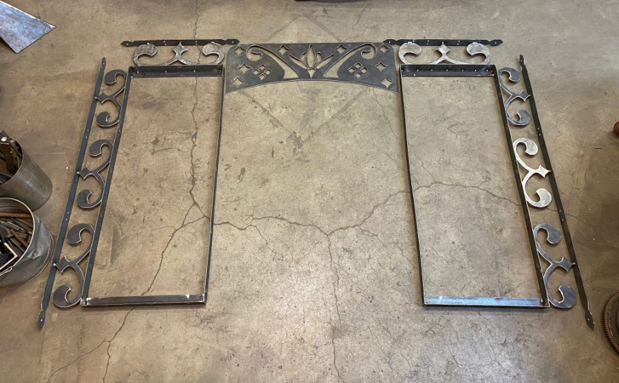 - Stained glass frames, mounts and center detail. These were plasma cut and fabricated. The design was inspired by the vintage glass provided by the client. Each panel is 20″Wx48″L, centerpiece is 3’Wx14″H.