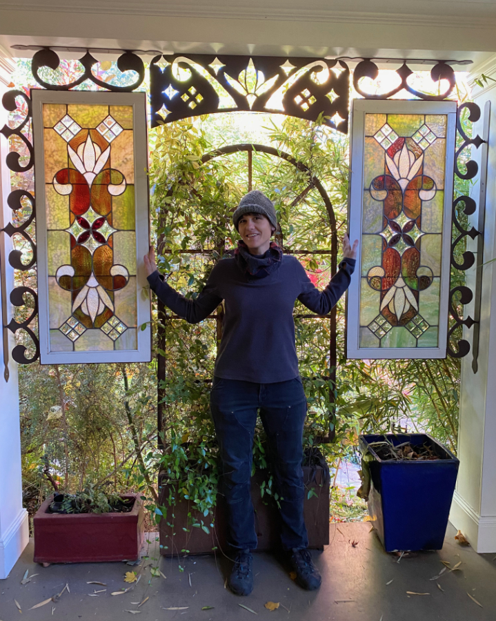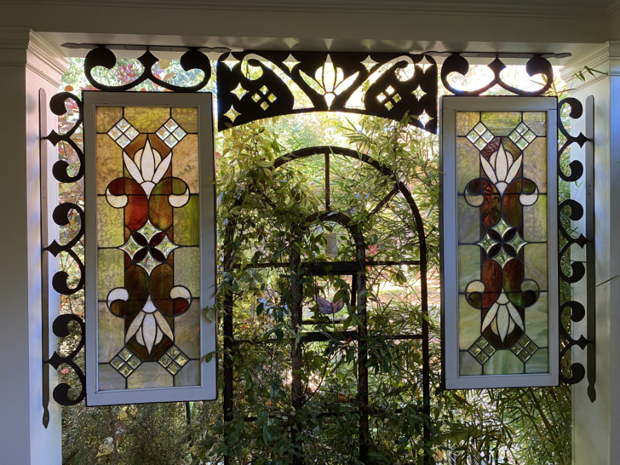 - Stained glass frames and center detail. Glass provided by the client. The wood was refinished and repainted. These were created an installed by the artist. Each panel is 20″Wx48″L, centerpiece is 3’Wx14″H.