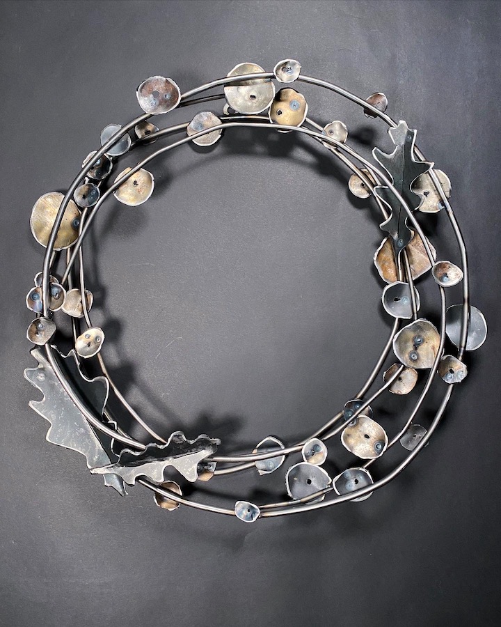 August 21, 2022 by indiometalarts Leave a comment ← Previous Image Next Image → Holy Berry with Oak Leaves Wreath, plasma cut steel, hammer shaped and hand bent, copper and steel, 18″W