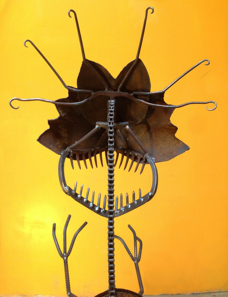 GARDEN DINOSAUR BACK April 6, 2016 by indiometalarts Leave a comment ← Previous Image Next Image → Dinosaur Predator back: pitch fork, rake for upper jaw, large bike chain, rebar hands, and three shovels. Dinosaur back: pitch fork, rake for upper jaw, large bike chain, rebar hands, and three shovels.