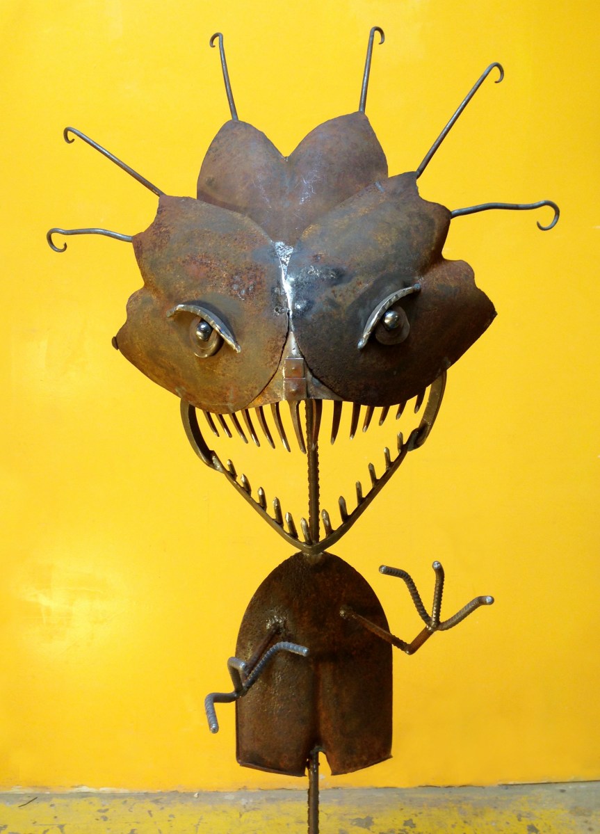 Dinosaur front: three shovels, ball bearings, rake for upper jaw, pitch fork tendrils, rebar, wrought iron scrap elements.