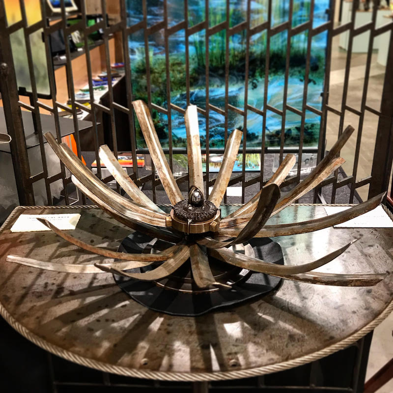 October 6, 2018 by indiometalarts Leave a comment ← Previous Image Next Image → Samurai Chrysanthemum, 17″W. Ball bearing, faucet handle, brass collar, reclaimed steel.