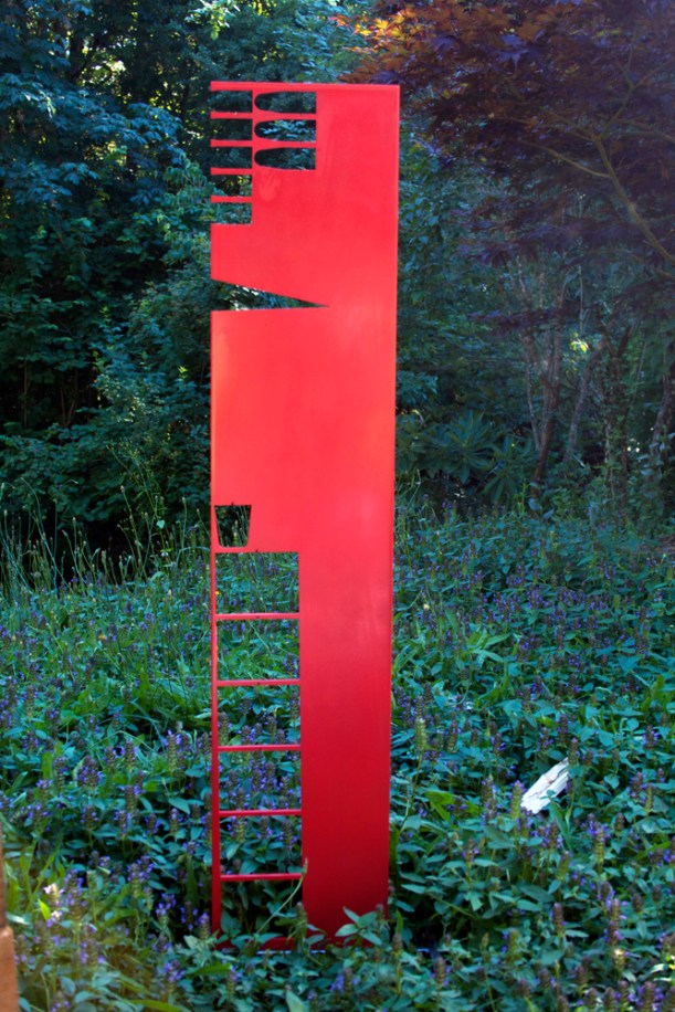 This red geometric piece is on top of a steep slope. Until the plants grow in, this playful bright pattern reminds one to watch their step. When the plants do come in, it will be a nice contrast to the green foliage. Thanks Bunny!